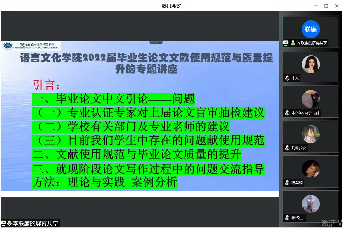 为提升专业毕业论文质量,保证毕业论文写作符合师范专业认证需要,语言文化学院于2022年5月5日通过腾讯会议APP线上方式开展了“毕生论文文献使用规范与质量提升”专题讲座。此次活动由学院科研办主办,李联廉博士主讲,2022届毕业生和部分老师参加。