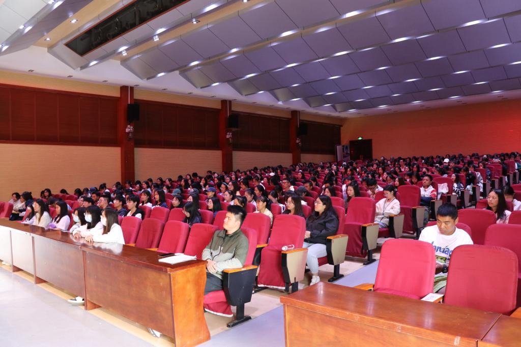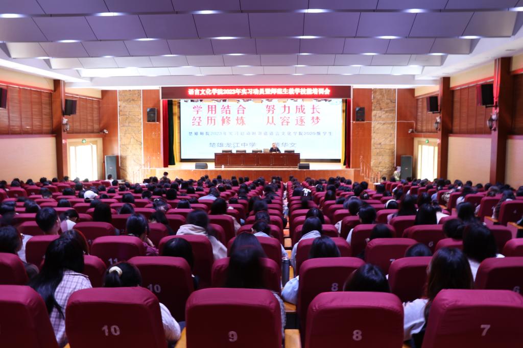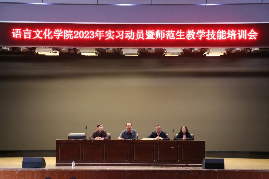 2023年9月13日上午,语言文化学院在雁塔校区上礼堂召开2023年学生实习动员暨师范生教学技能培训会。语言文化学院2020级本科专业和2022级专升本班即将参加实习的500余名学生和班主任、辅导员参加了此次动员暨培训会,会议由语言文化学院党委书记姜明老师主持。