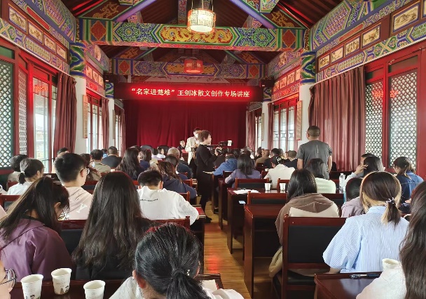 2023年3月27日下午,语言文化学院40名同学在辅导员杨春梅老师的带领下统一乘坐校园大巴车到彝人古镇社区参加了楚雄州文联举行的“名家进楚雄”专场讲座活动,聆听了湖南省作家协会副主席、著名作家王剑冰老师的专题讲座。