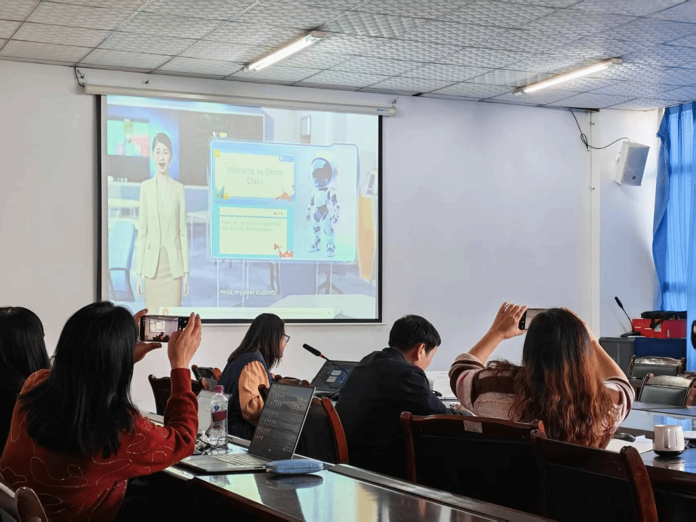王玉芬老师结合 “AI 时代云南地方院校大学英语教学方式的变革研究” 项目,从 AI 技术由来、常用工具、高校专属提示词等基础内容切入,重点开展实操教学。她首先分享前期针对 3 所院校英语教师的调研数据:82.72% 教师对 AI 有基础认知,77.8% 将其用于备课辅助,93.83% 愿深入学习 AI 技术。随后,她现场演示 AI 在教案撰写、作业批改、自动化出卷、PPT 生成及数字人制作等场景的应用,推荐豆包、Kimi、有言数字人等免费工具,强调使用时需明确 AI 身份定位、迭代提示词,同时警惕隐私泄露与内容错误,避免过度依赖。针对网络拥堵问题,她建议教师使用个人热点参与实操,确保培训顺利推进。