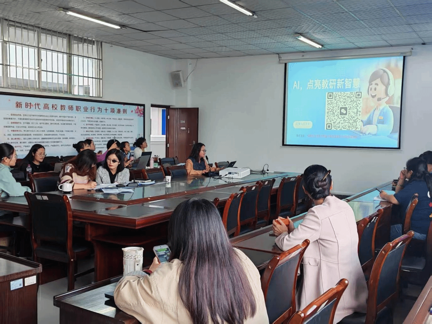 2025年10月29日下午16时30分,外国语学院组织第三次集中磨课活动,特邀王玉芬老师以 “AI 点亮教研新智慧” 为主题,开展 AI 技术在大学英语教学中的应用培训,全体教师参会。