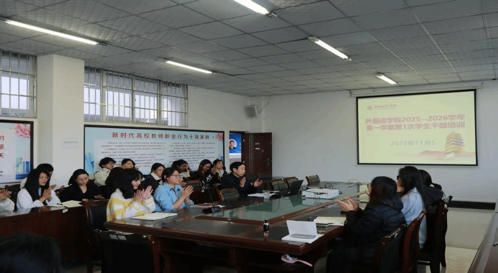 为提升学生干部综合素质,夯实学院学生教育管理工作基础,11 月 5 日下午,外国语学院在博文楼 304 会议室举办 2025-2026 学年第一学期首次学生干部培训。学院党委副书记刘炳龙主讲,各班班团干部、学院分团委及学生会骨干参加培训。
