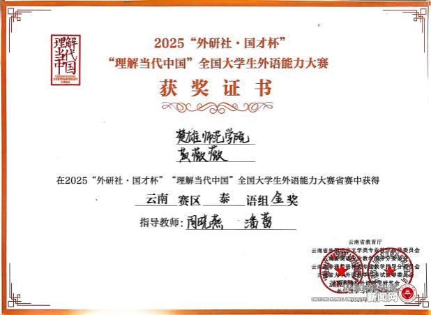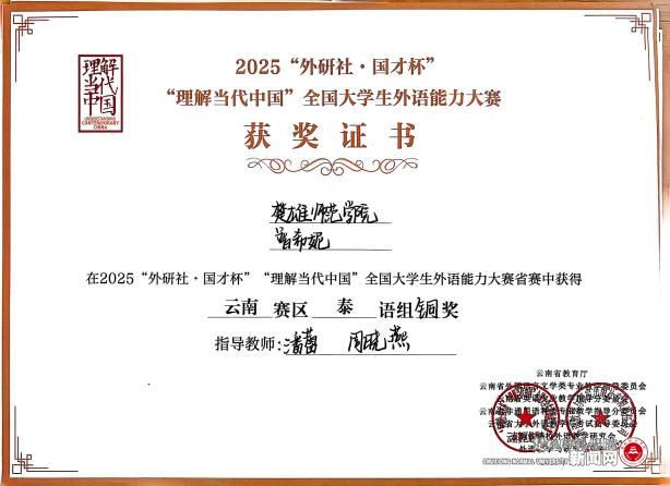 近日,2025“外研社·国才杯”“理解当代中国”全国大学生外语能力大赛圆满落幕,我校学生黄薇薇和普希妮凭借扎实的泰语基础和出色的语言运用能力,在云南赛区泰语组比赛中荣获一金一铜的优异成绩。
